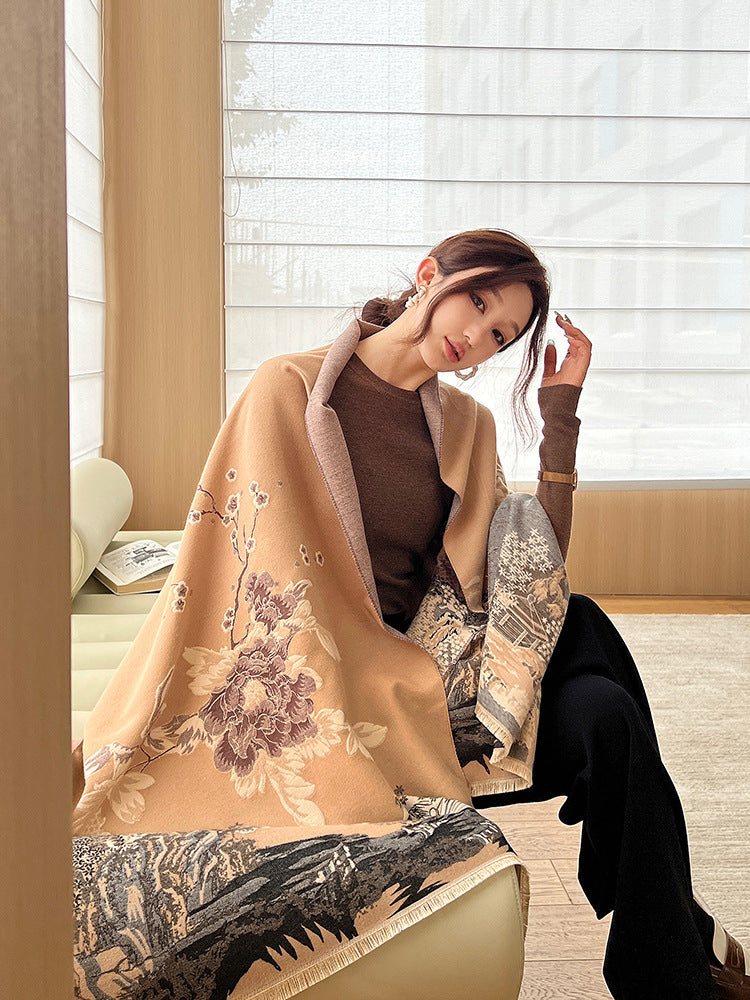 Bufanda de cachemira sintética gruesa y versátil de estilo chino para mujer, ideal para otoño e invierno, ideal para habitaciones con aire acondicionado, protección para el cuello y abrigo de doble uso.