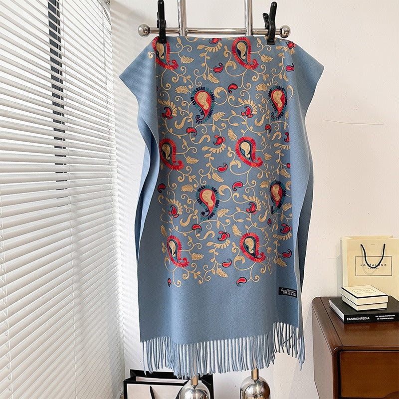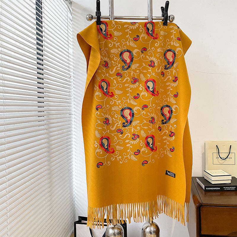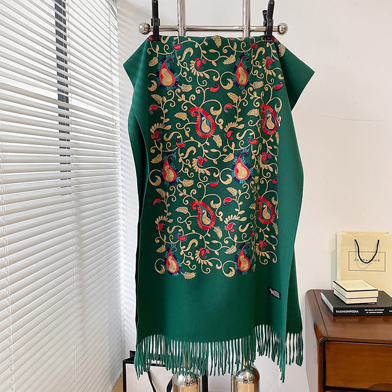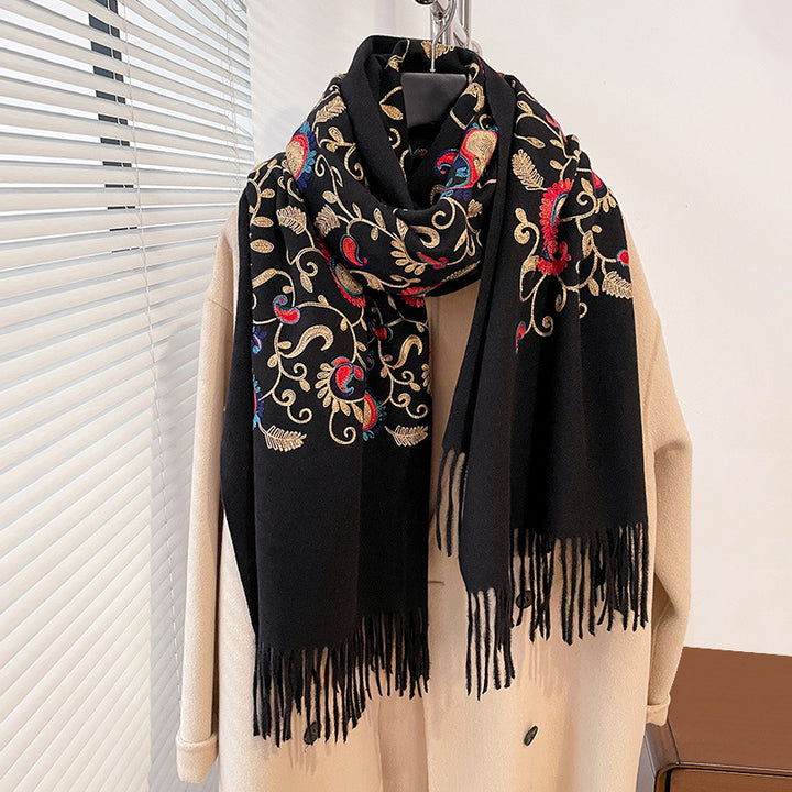 Esta nueva bufanda de otoño e invierno luce un delicado bordado de flores de enredadera, que captura la esencia del estilo étnico con patrones tradicionales que evocan una sensación de elegancia cultural. Hecha de cachemira sintética de alta calidad, la bufanda proporciona calidez y comodidad, perfecta para el frío. Su diseño versátil permite usarla como capa exterior para viajar o como chal para realzar cualquier atuendo. El intrincado bordado le aporta un toque de refinamiento y arte, convirtiéndola en un accesorio perfecto para otoño e invierno.