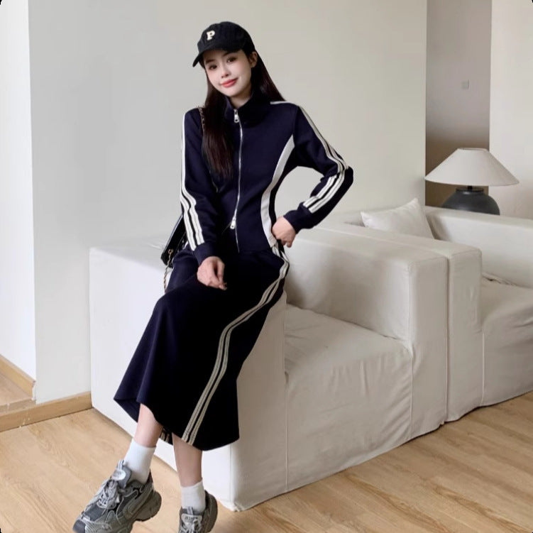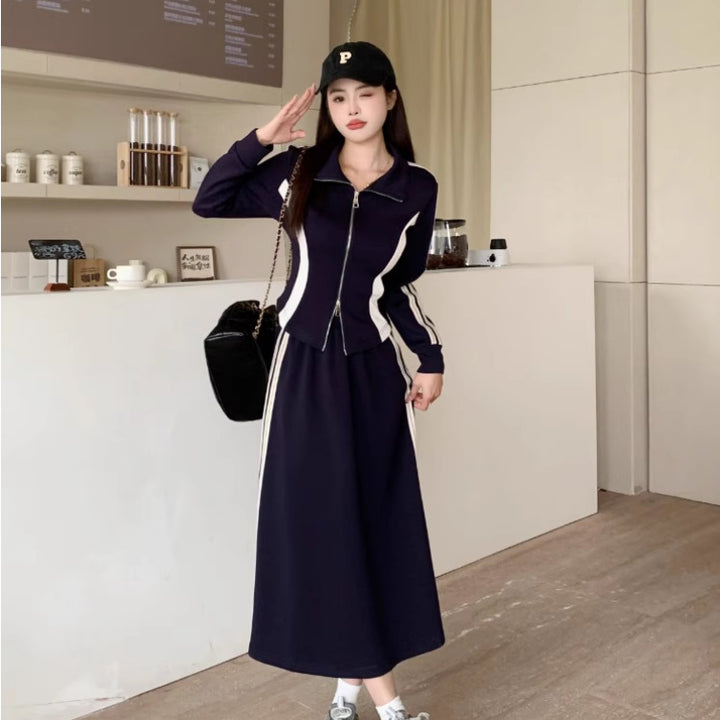 Conjunto deportivo informal de moda: sudadera con capucha y falda adelgazantes de dos piezas para mujeres de talla grande.