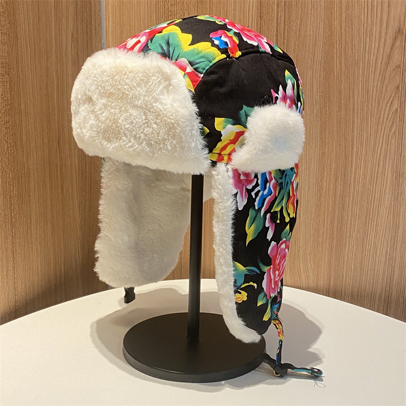 Gorro de invierno Lei Feng para mujer: cálido y protector auditivo, gorro de algodón con estampado floral del noreste para hombre, gorro de cola de estilo étnico retro.