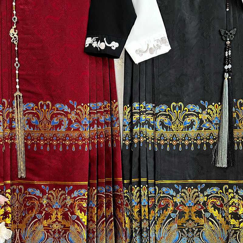 - 优雅马面裙:传统的百褶裙,饰有精美的织金图案和精致的花卉刺绣。