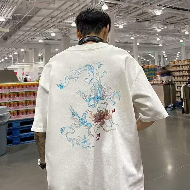 国潮中国风凤凰T恤-白色纯棉加大码男士夏季T恤